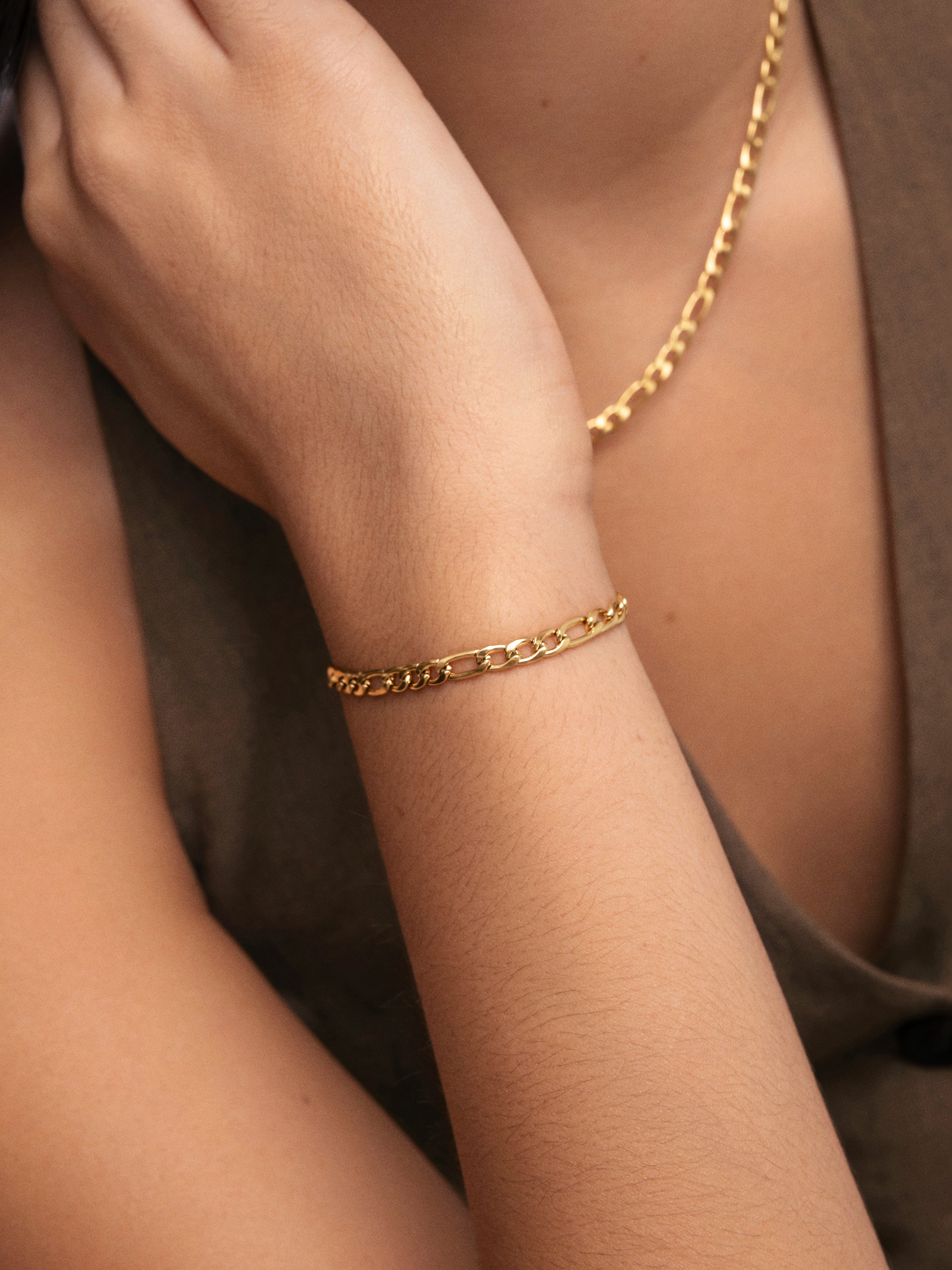 Una pulsera de eslabones finos perfecta para llevar como brazalete de diario. 💛 Una pulsera de eslabones tipo Fígaro llena de elegancia y sencillez.